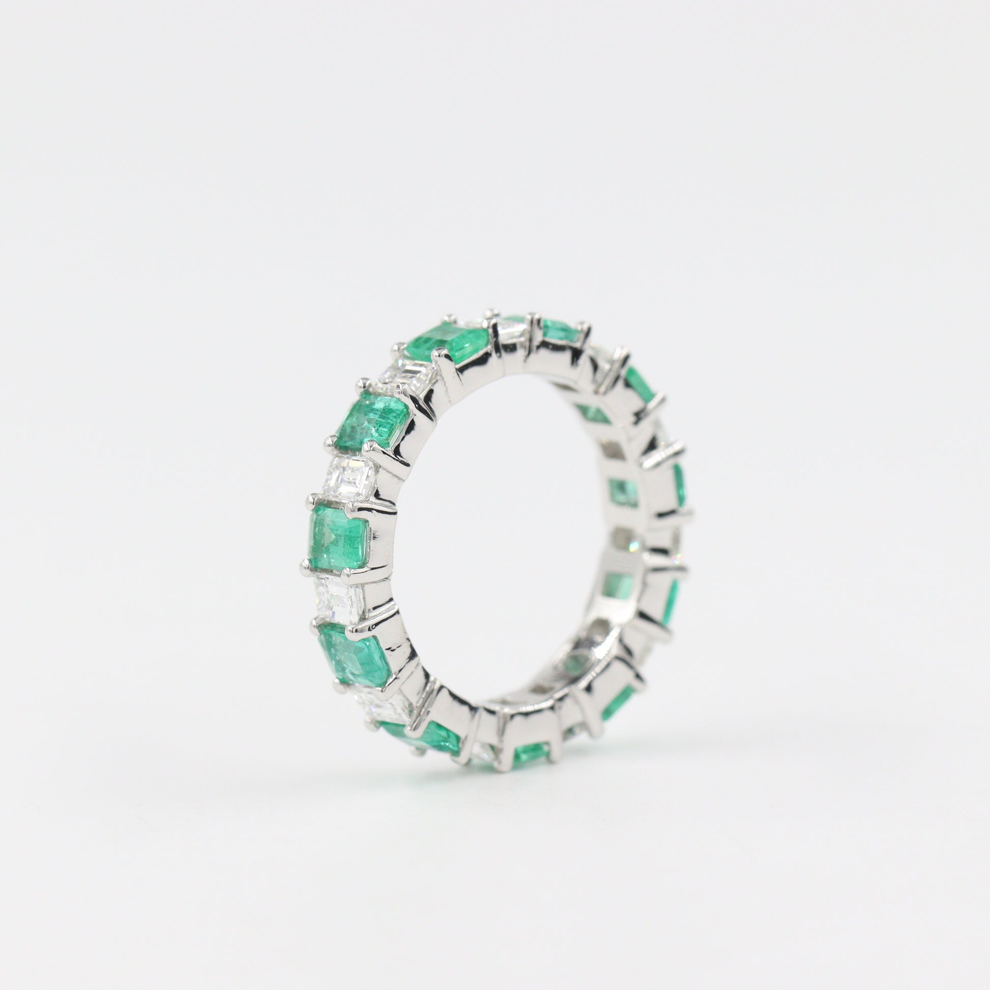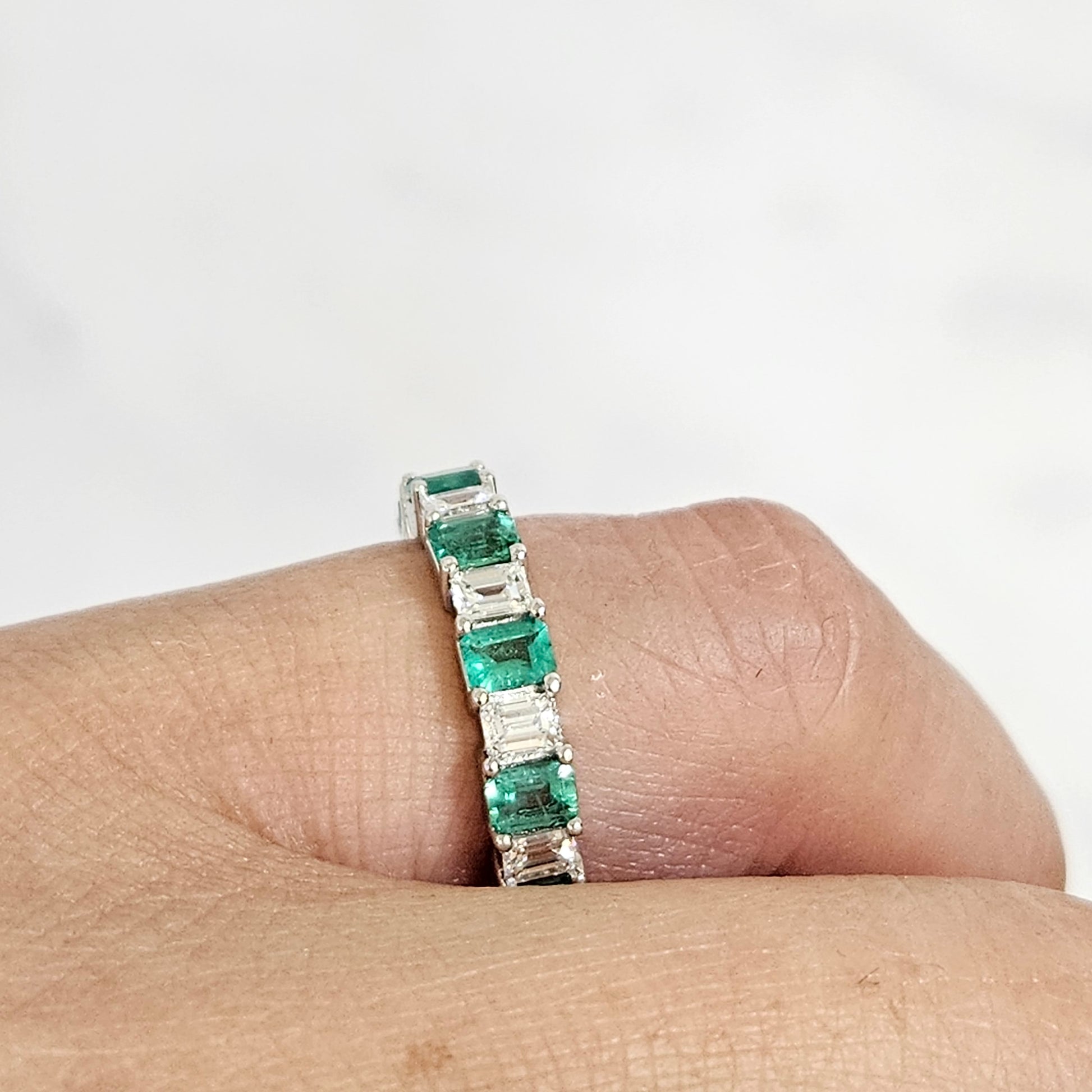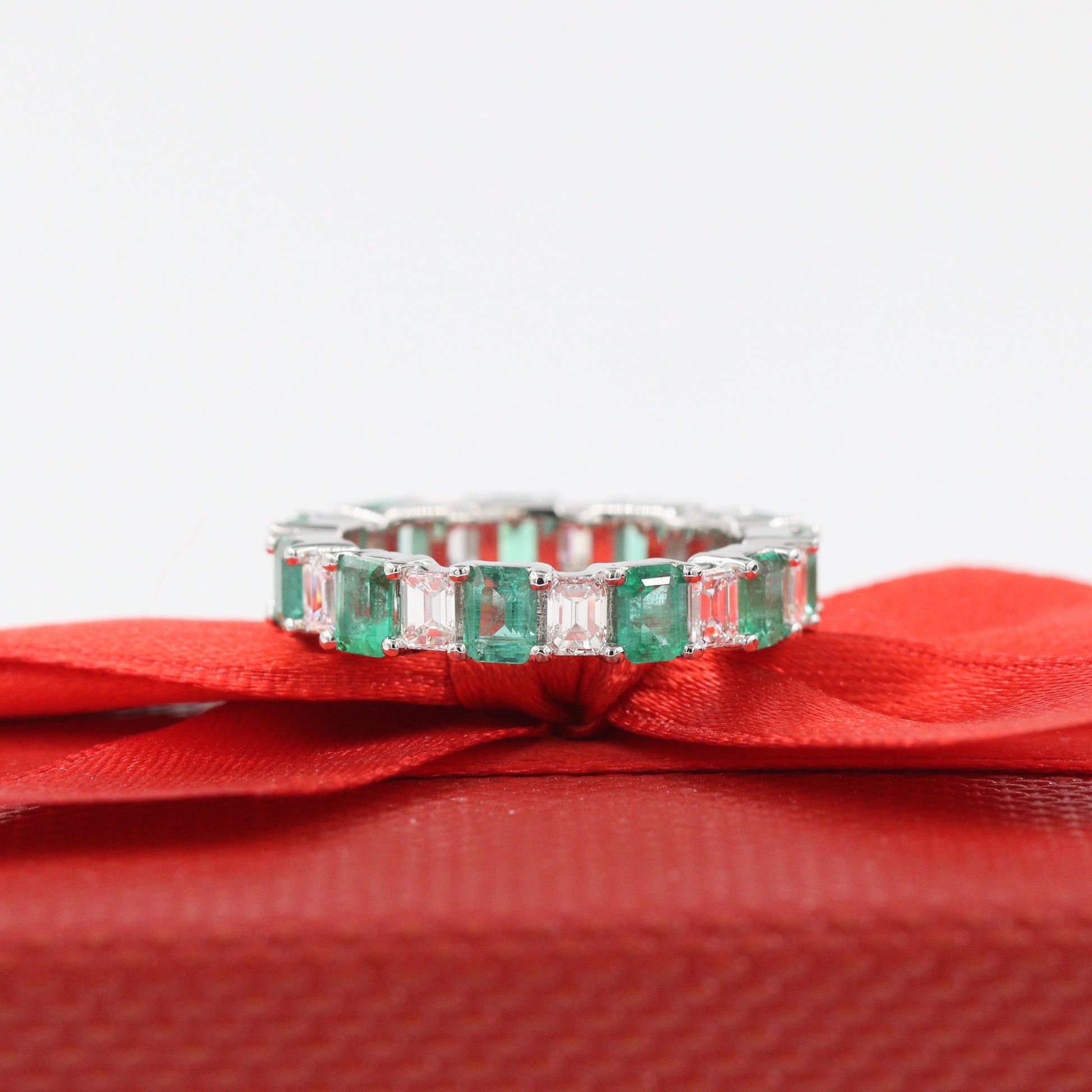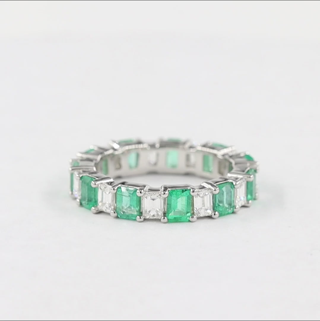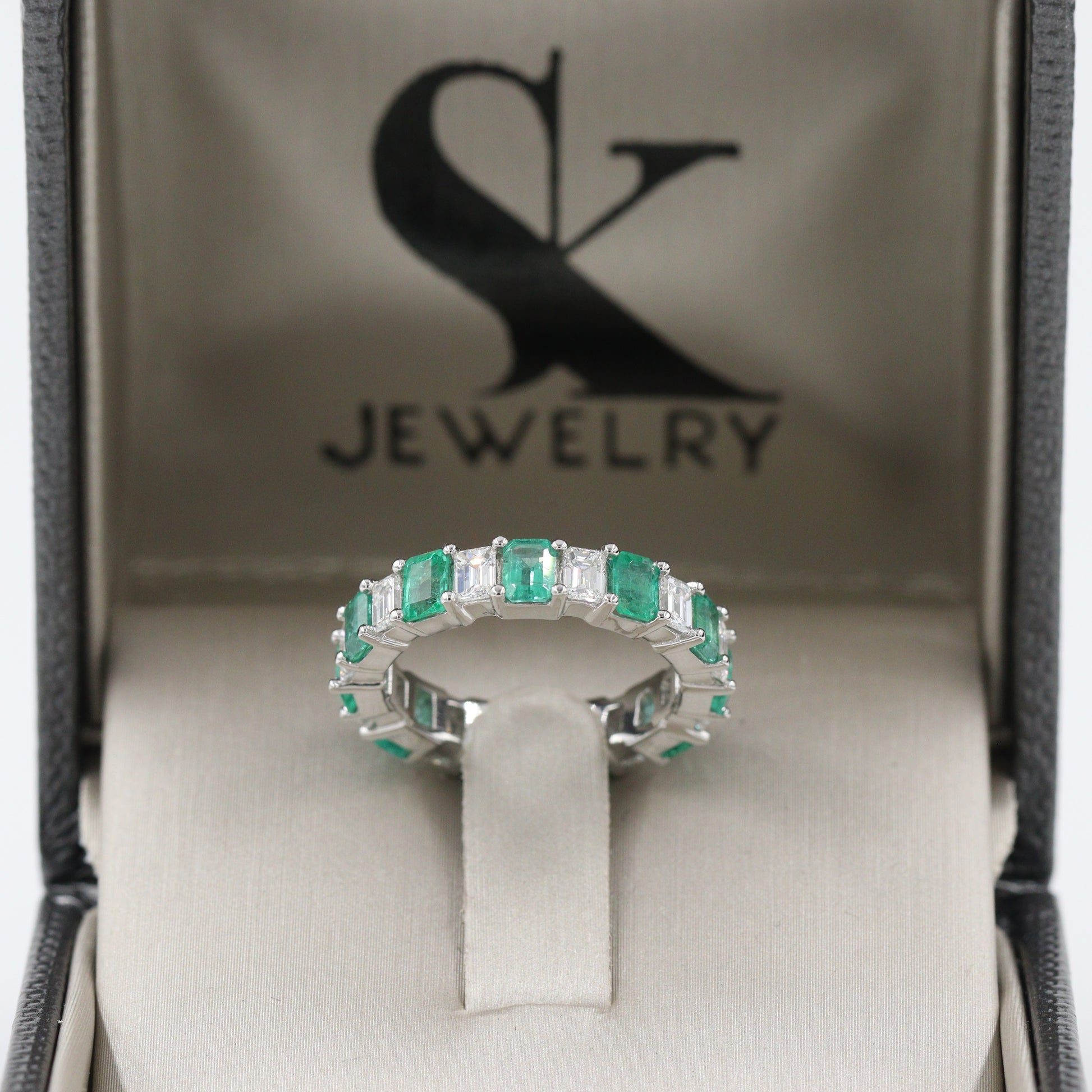 3.1ct Natural Green Emerald & Emerald Cut Diamond Ring / Alternating Full Eternity Width 4.1mm Platinum Wedding Ring / Anniversary gift