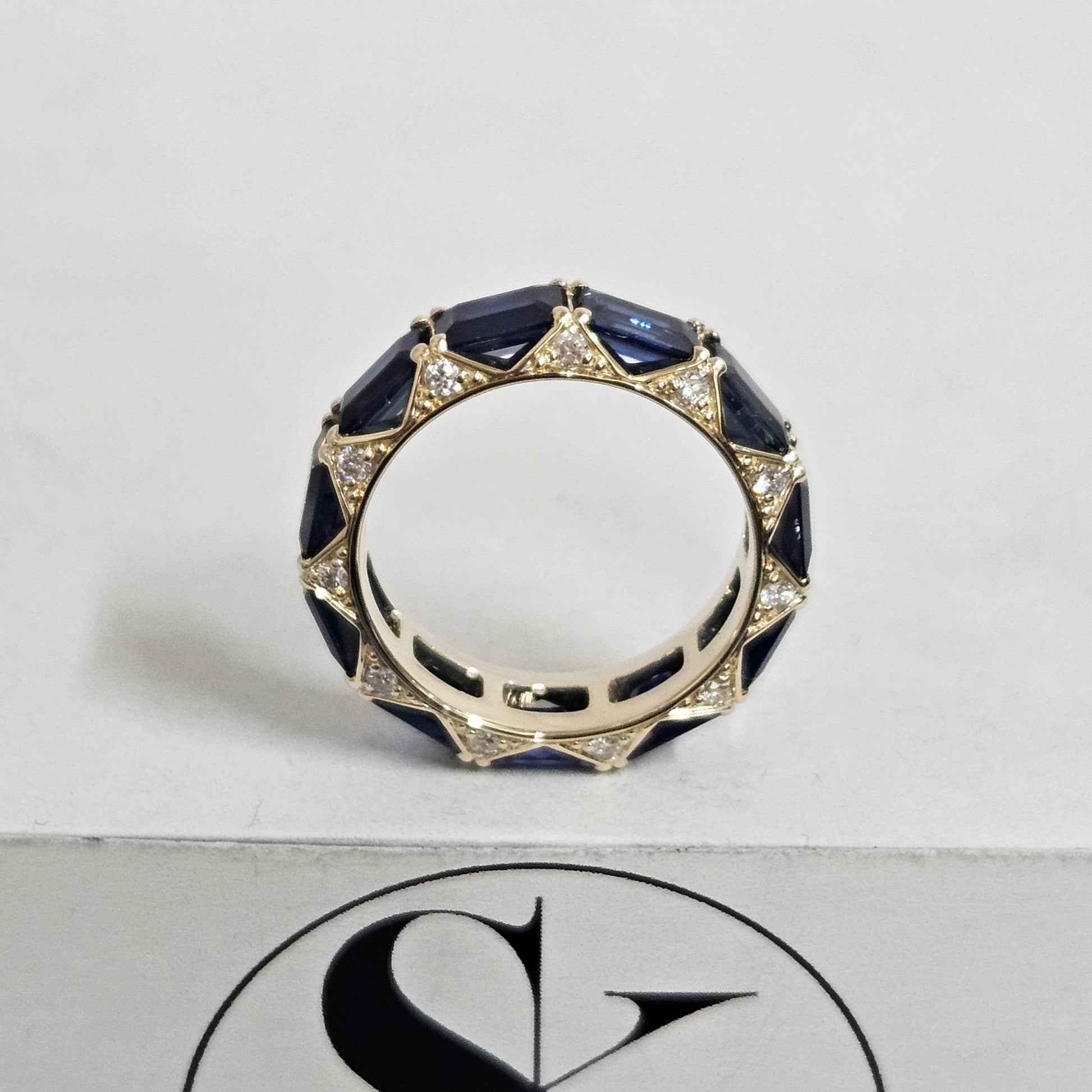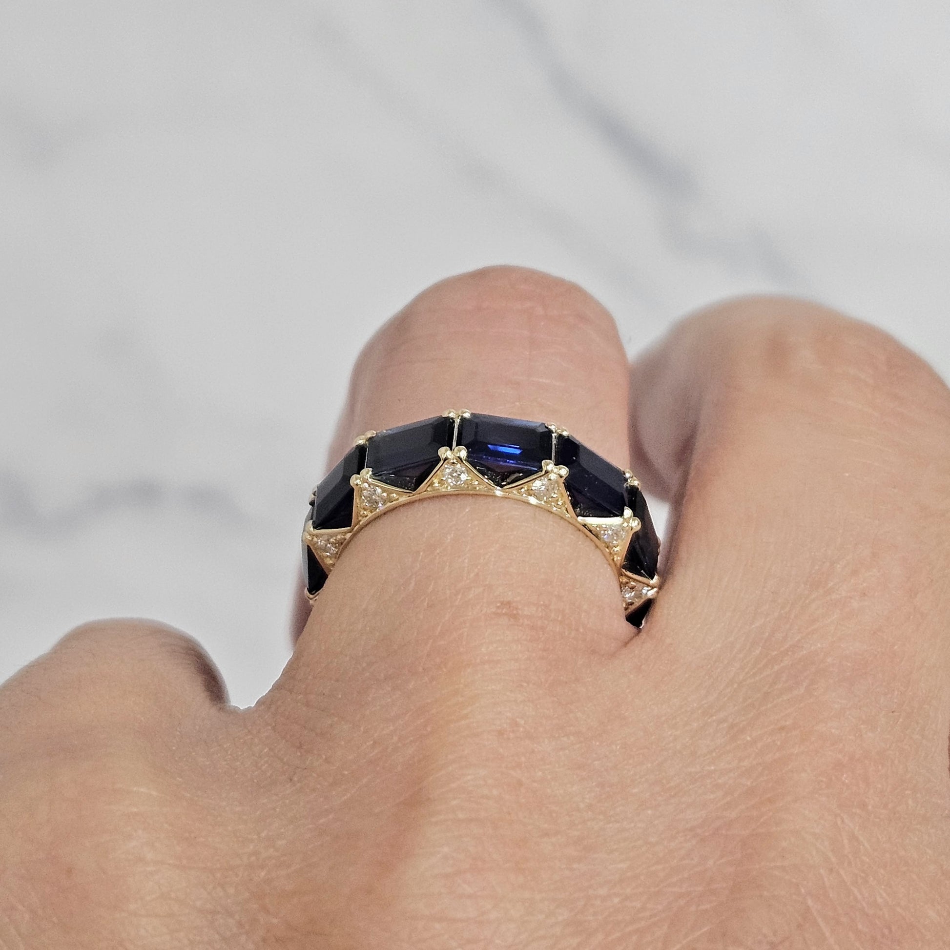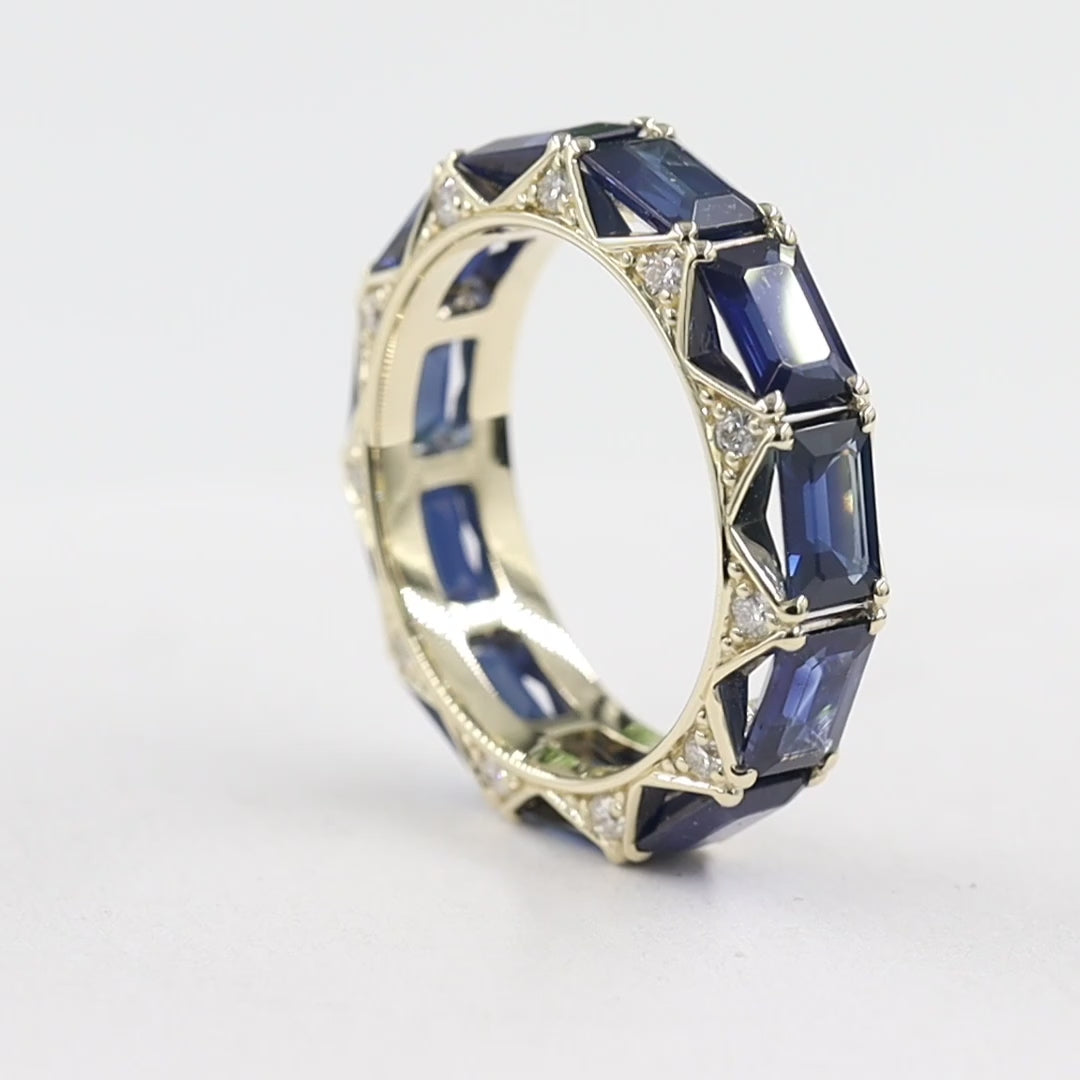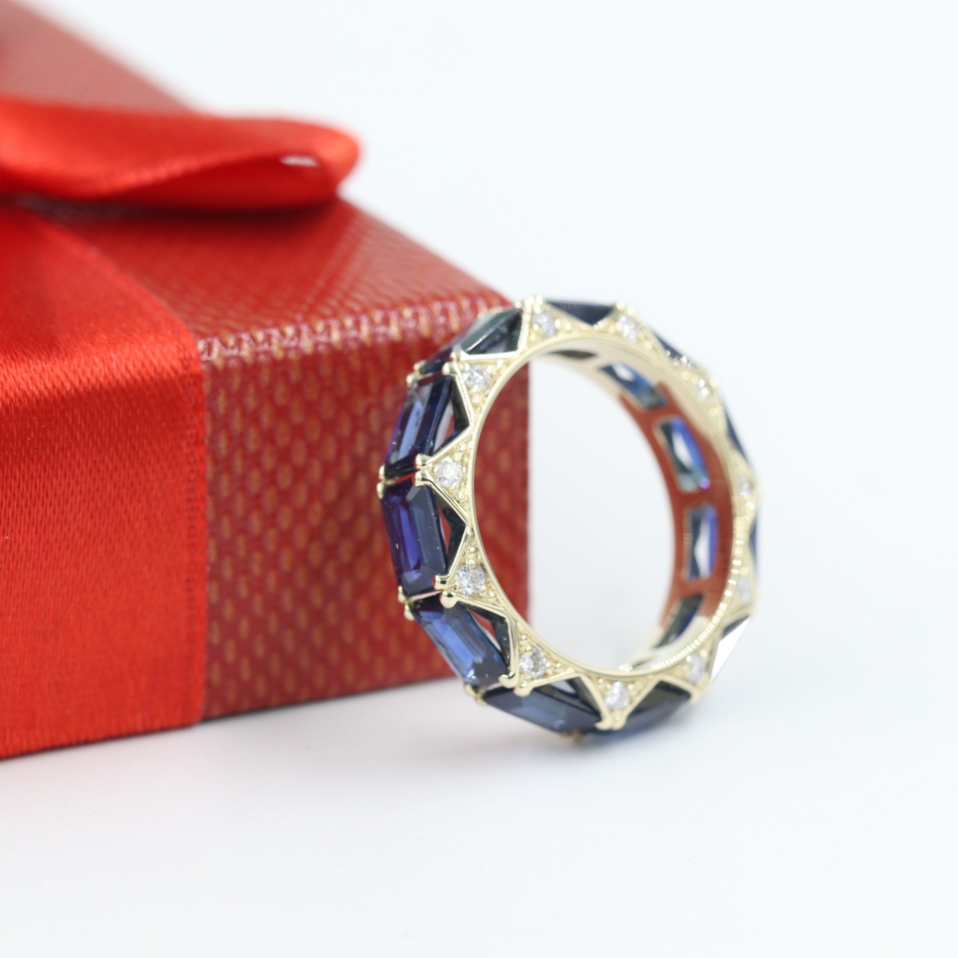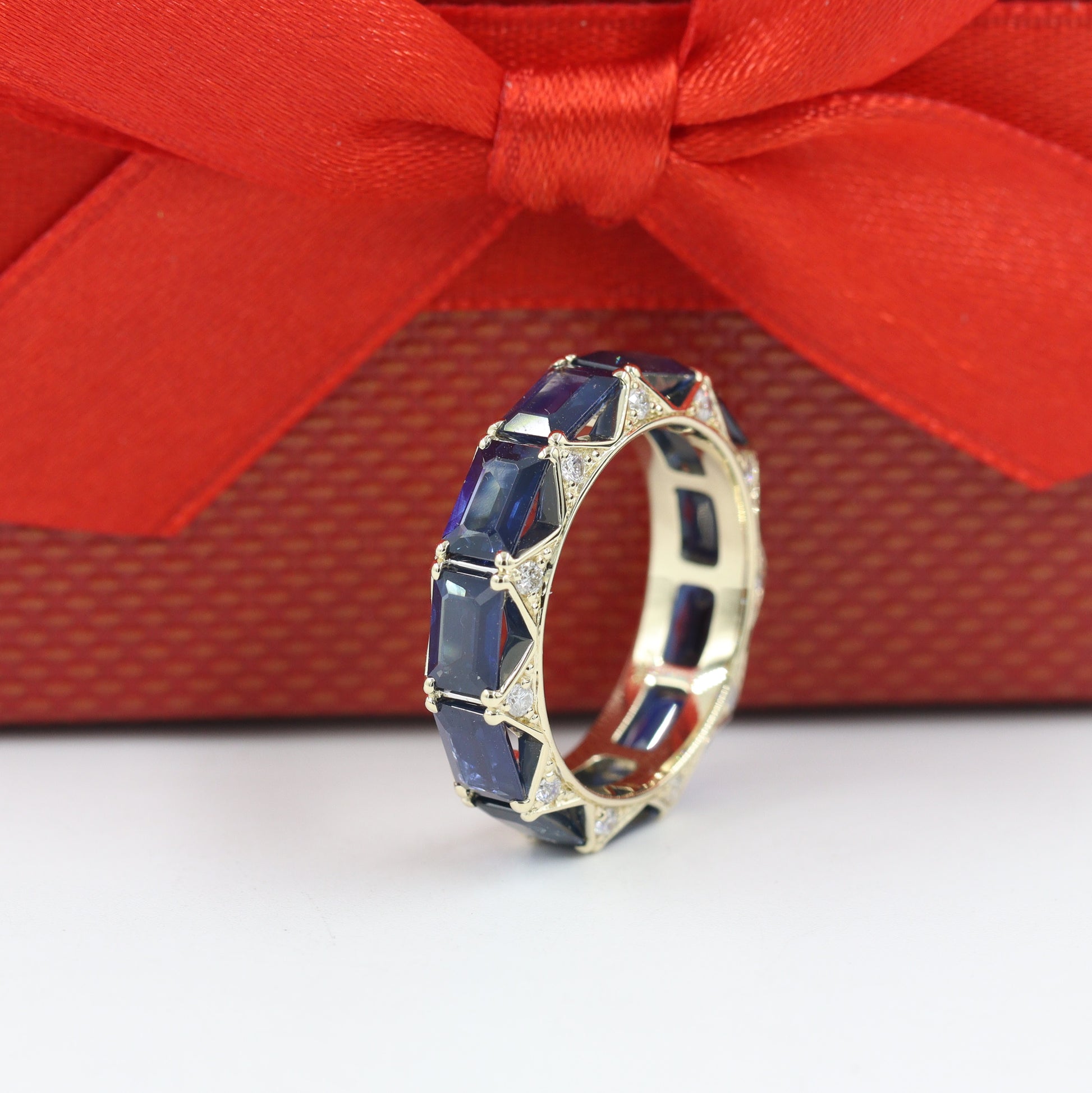Blue Sapphire Emerald Cut Full Eternity Ring/Natural blue Sapphire Diamond Band/Emerald Cut blue Sapphire, Diamond Anniversary Ring