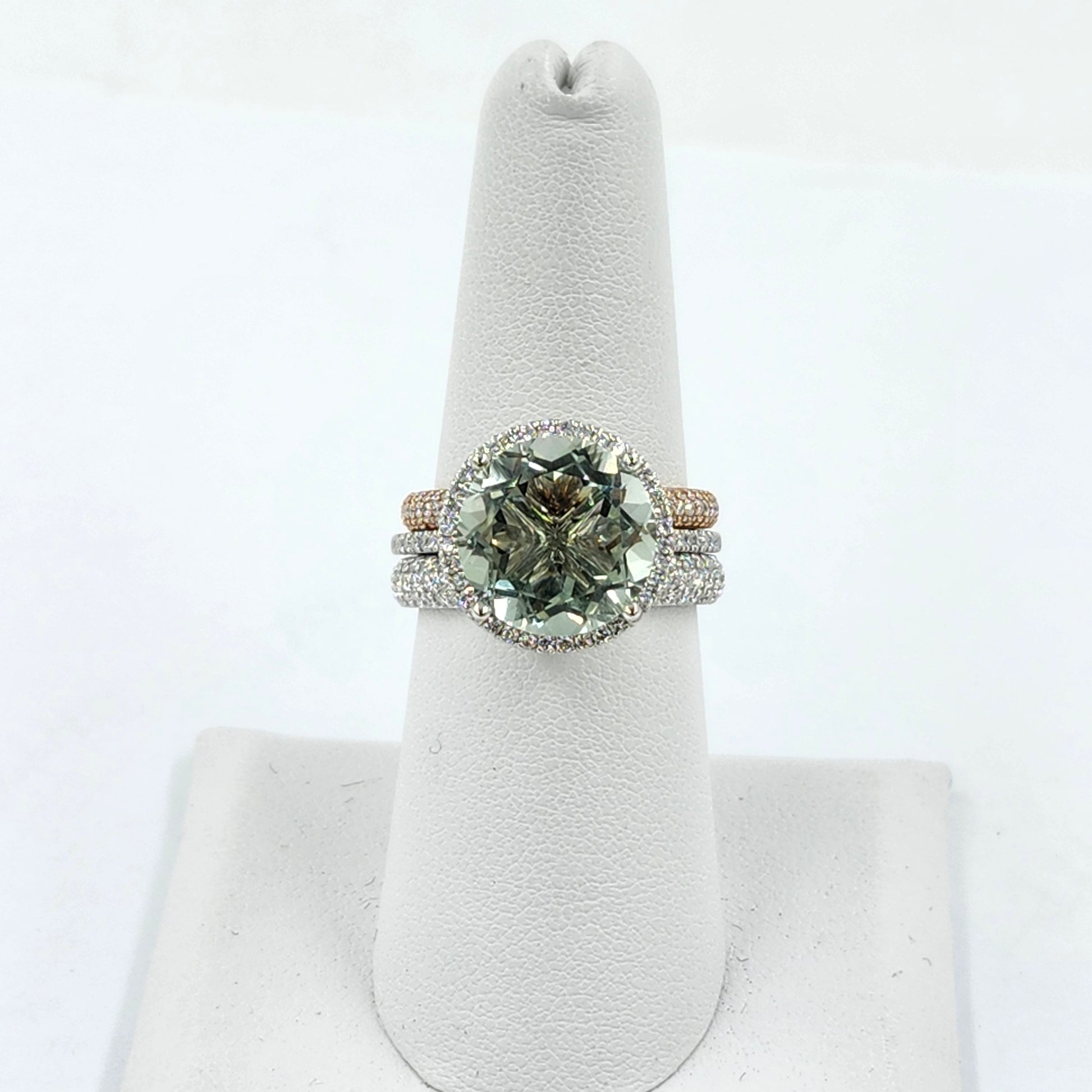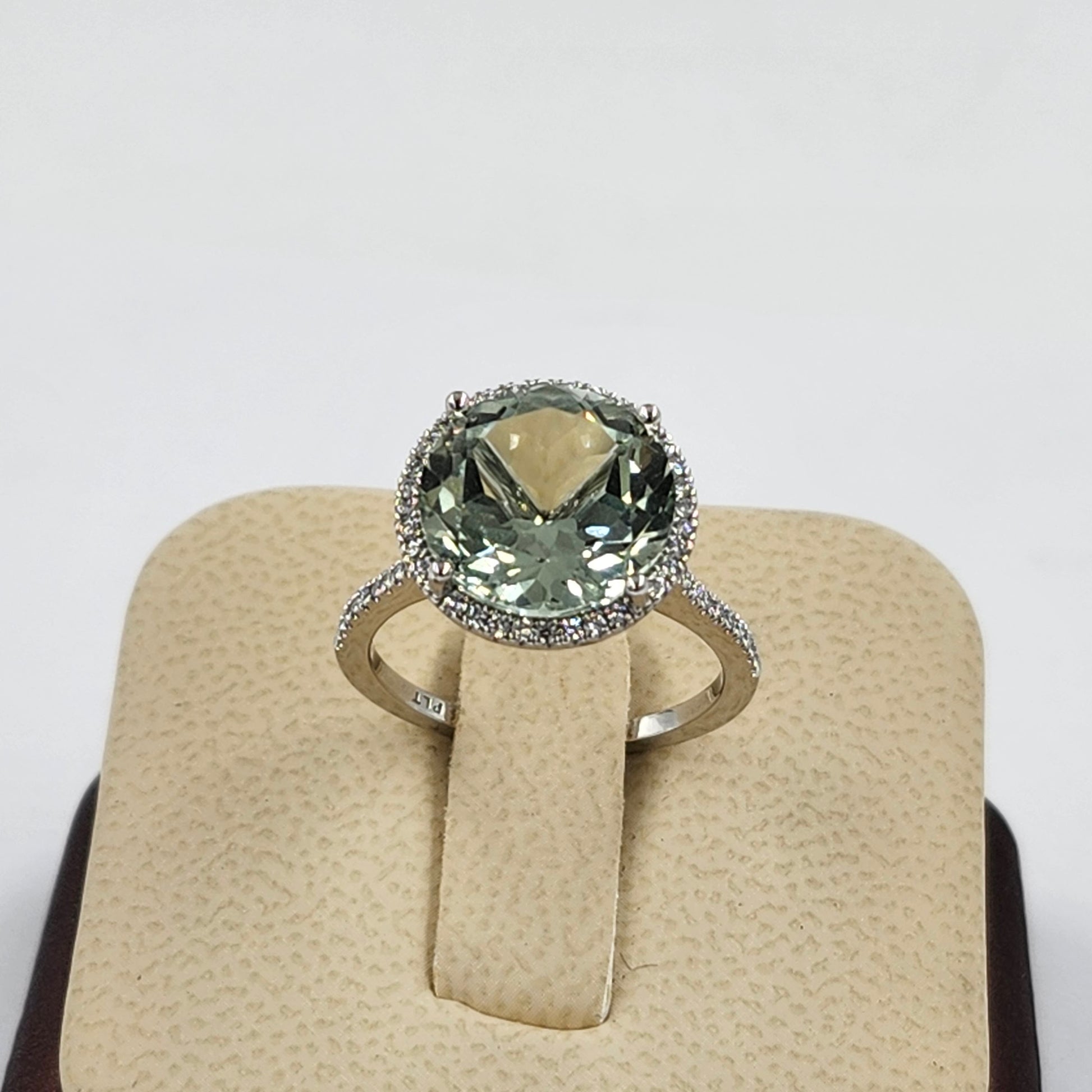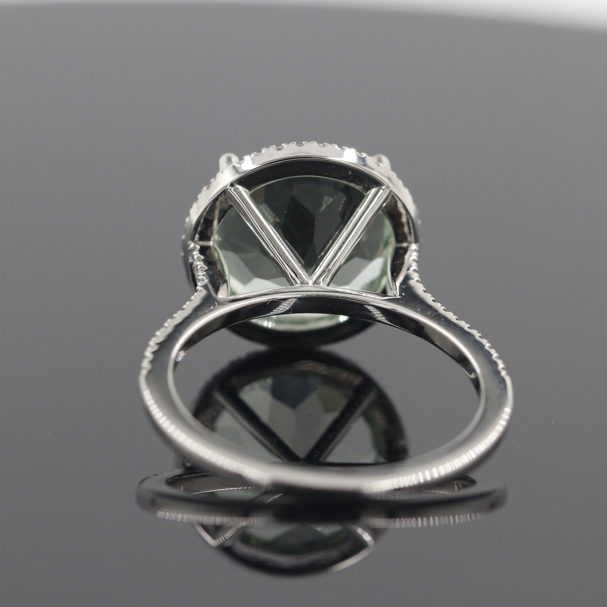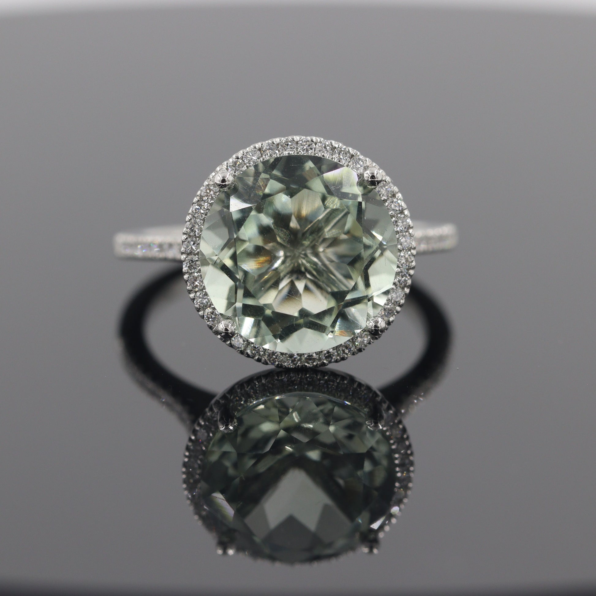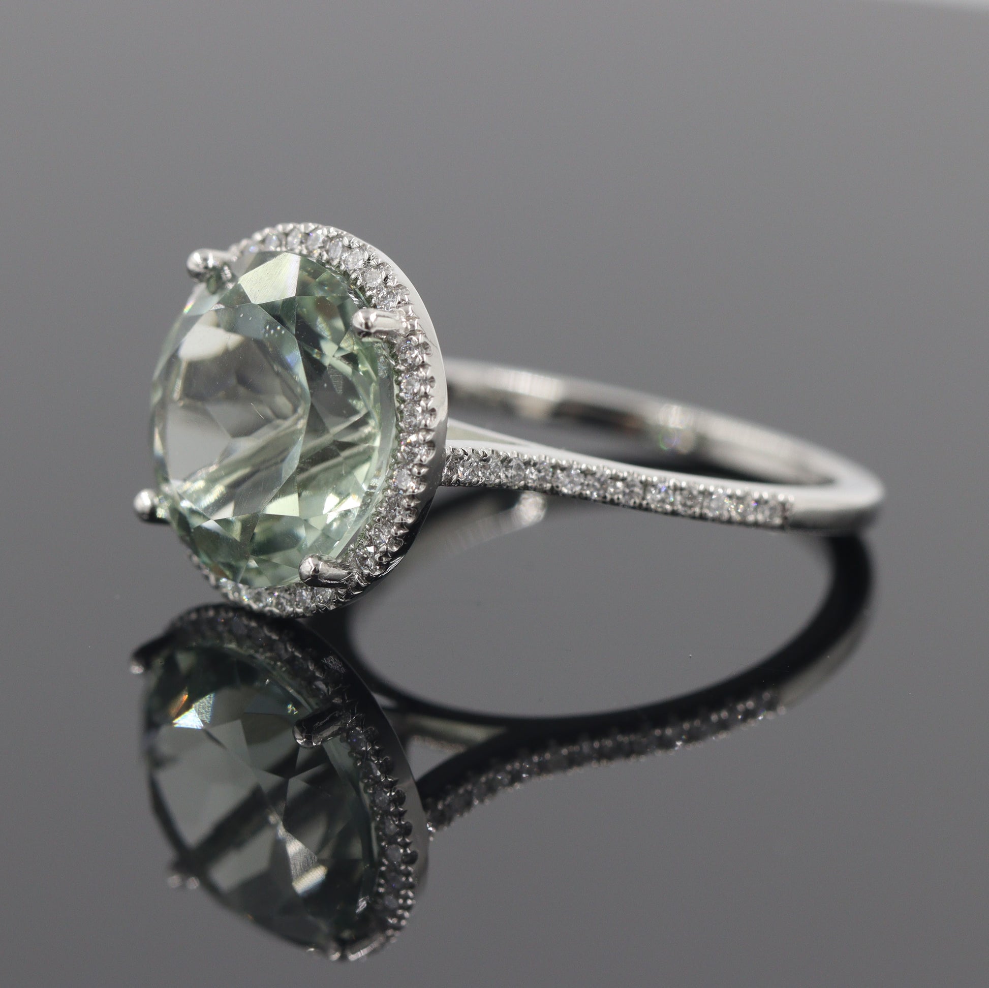 Handmade Platinum Green Amethyst Ring: Lab Grown Diamond Halo Ring - Anniversary gift